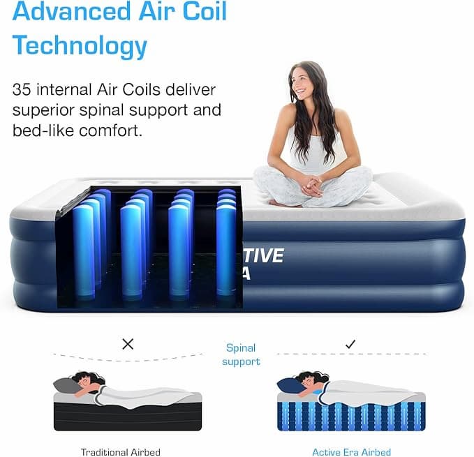 بالش توکار: این تشک بادی با پمپ تعبیه شده همچنین دارای یک بالش برجسته داخلی ۲ اینچی برای بهبود پشتیبانی از سر و گردن، و تراز ستون فقرات بهبود یافته برای راحتی تخت در طول شب است.